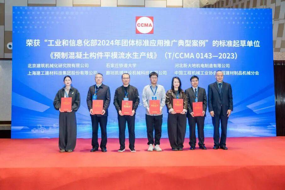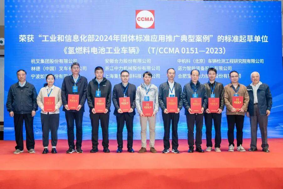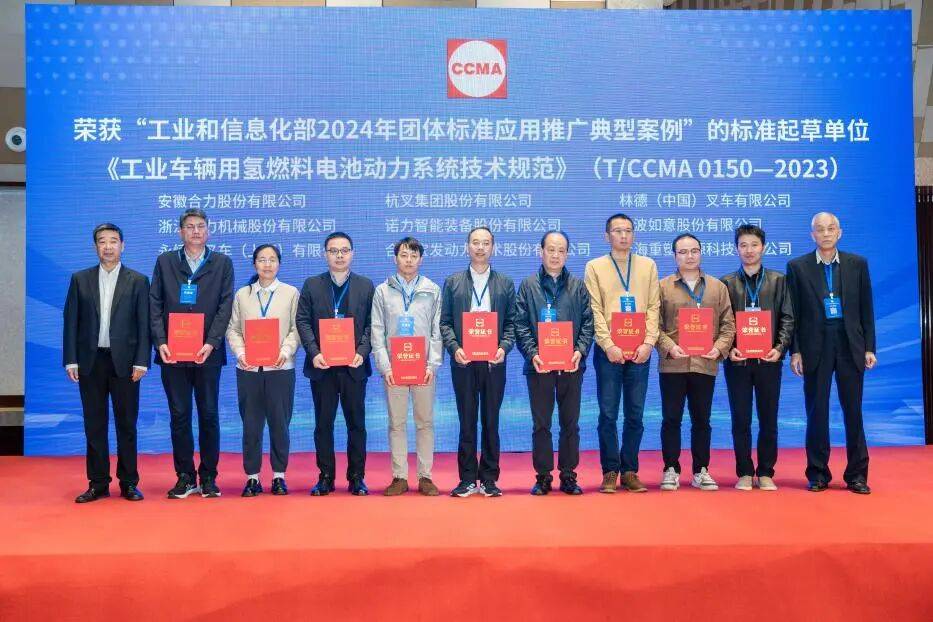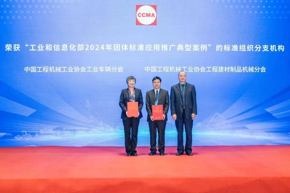 2024年由协会申报的《预制混凝土构件平模流水生产线》《工业车辆用氢燃料电池动力系统技术规范》《氢燃料电池工业车辆》三项工程机械团体标准获得“工业和信息化部 2024 年团体标准应用推广典型案例”殊荣,三项标准参与研制单位达到三十余家。与会领导为获此殊荣的分支机构及标准研制单位代表颁发了证书。